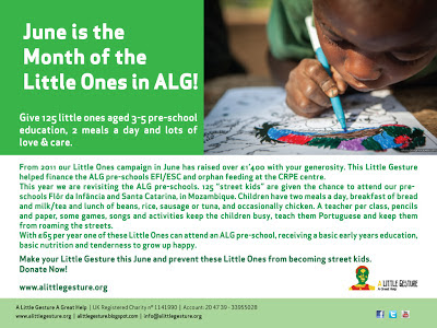 This month, each of us can help children like Rui. Our pre-schools receive 170 children aged 3-5 years old and cost ALG from £6'000 per year each, including two daily meals per child, teachers and school materials.