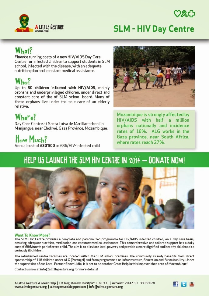 The SLM HIV Centre provides a complete and personalized programme for HIV/AIDS infected children, on a day care basis, ensuring adequate nutrition, medication and constant medical assistance. This comprehensive and tailored support has a daily cost of £86/month per infected child. The aim is to alleviate local poverty and provide a more dignified and healthy childhood to seriously ill children.
