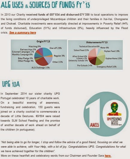 In 2014 ALG welcomed a record number of new supporters in the UK and launched exciting new projects in Mozambique, consolidating our six hubs of local and direct intervention. Mostly centred on the vibrant SLM School, new projects include a full rollout of a school-feeding programme for over 800 students and a new HIV centre for up to 50 infected children. We even started our very first crowdfunding campaign for one of our young entrepreneurs.
