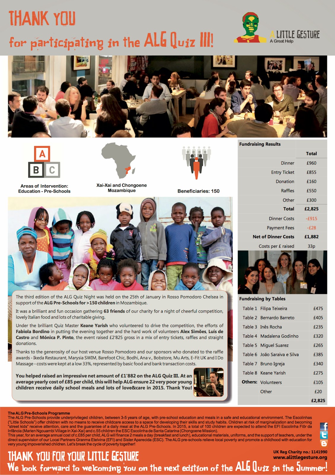 Under the brilliant Quiz Master Keane Yarish who volunteered to drive the competition, the efforts of Fabiola Bordino in putting the evening together and the hard work of volunteers Alex Simões, Luís de Castro and Mónica P. Pinto, the event raised £2'825 gross in a mix of entry tickets, raffles and straight donations.