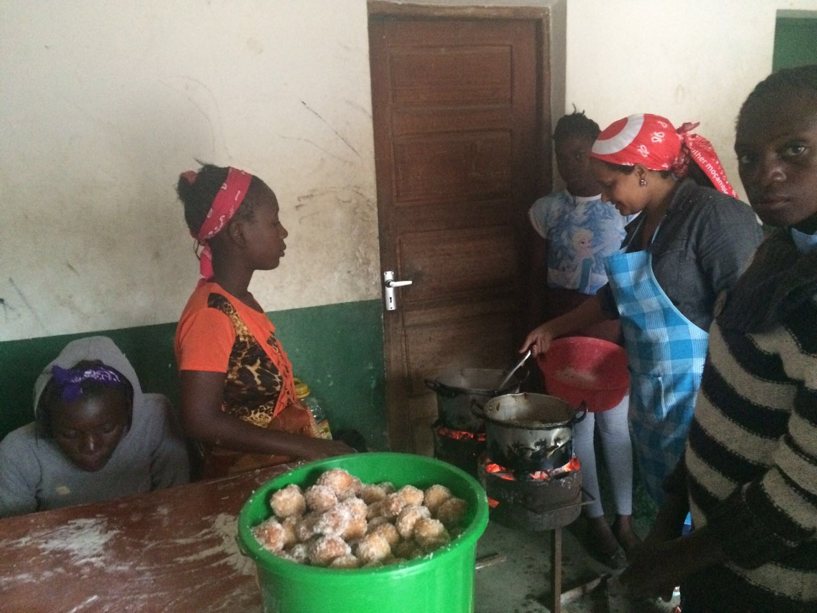 We returned to SVP to catch the culinary class midway. Today Lucilia showed the students how to make delicious fried dough covered in coconut. Everyone was very focused on their tasks and delighted to be there. And we of course could not resist and bought a package of 10 for 30 meticais. The others will be sold tomorrow.